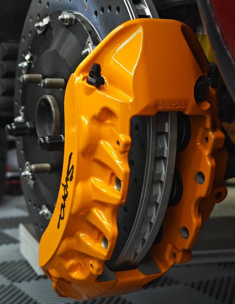 Each brake system is designed around vehicle specific constraints including suspension geometry, wheel clearance, and hydraulic balance. Rotor diameter, thickness, disc annulus, and caliper piston sizing are evaluated to achieve optimal torque output, pedal feel, and thermal capacity. Every caliper used in Tustin Garage systems originates from OEM production road cars.