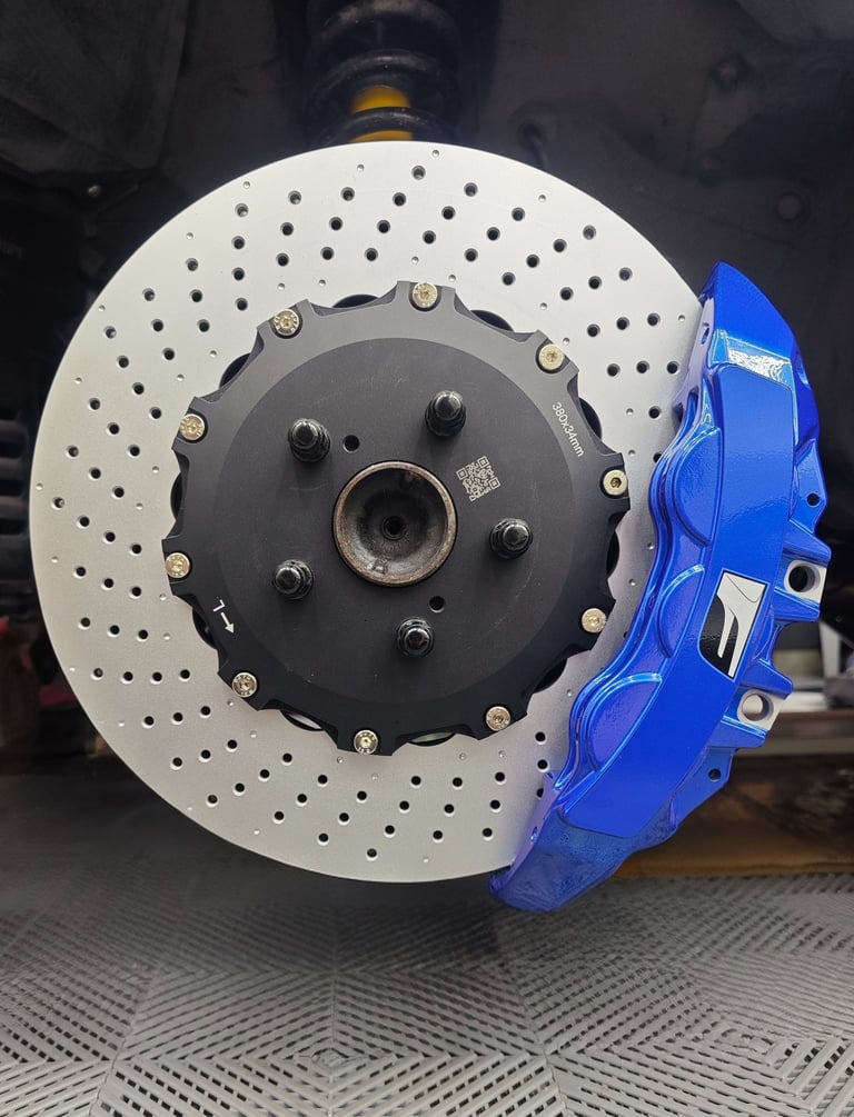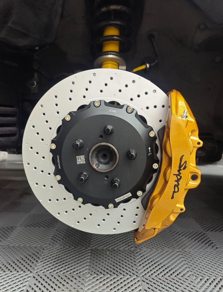 100% Direct bolt-on Front Big Brake Kit for the MKIV Supra. Calipers are sourced from the Lexus RCF/GSF base models and are shaven as necessary to clear the vehicle's spindles. Caliper placement remains in the OEM position. OEM Supra Drum-In-Hat parking brake is fully retained.