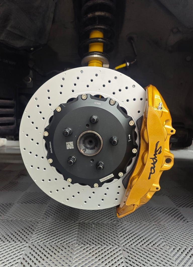 100% Direct bolt-on Front Big Brake Kit for the MKIV Supra. Calipers and discs are both sourced from the Lexus RCF/GSF Base models. Caliper placement is positioned in a lower position which allows the installation to require zero modifications to the car or caliper.