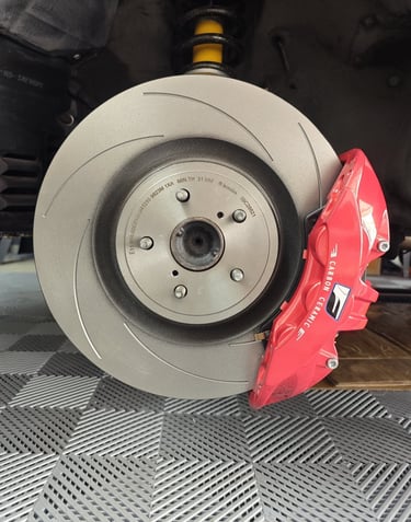 100% Direct bolt-on Front Big Brake Kit for the JZA80 Supra. Calipers and discs are both sourced from the Lexus RCF/GSF Base models. Caliper placement is positioned in a lower position which allows the installation to require zero modifications to the car or caliper.