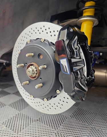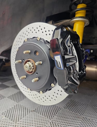 100% Direct bolt-on Front Big Brake Kit for the JZA80 Supra. Calipers are sourced from the Lexus RCF/GSF base models and are shaven as necessary to clear the vehicle's spindles. Caliper placement remains in the OEM position. OEM Supra Drum-In-Hat parking brake is fully retained.